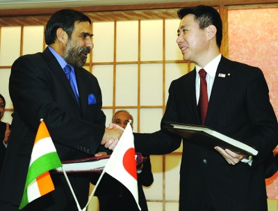 日本外務(wù)大臣前原誠(chéng)司與到訪的印度商業(yè)和工業(yè)部長(zhǎng)阿南德·夏爾馬分別代表兩國(guó)政府簽署了協(xié)定。兩國(guó)政要用“美妙”“具有歷史性”等詞句評(píng)價(jià)此次簽署的協(xié)議。前原表示,希望以此為契機(jī),使兩國(guó)的戰(zhàn)略伙伴關(guān)系得到進(jìn)一步發(fā)展。夏爾馬表示,正處于快速增長(zhǎng)期的印度期待日本企業(yè)的進(jìn)駐。