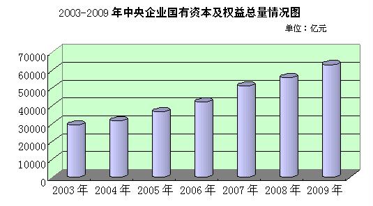 一、國有資產保值增值情況。2009年末,129家中央企業擁有國有資本及權益為62930.9億元,比2009年初增加6987.4億元,增幅為12.5%;比2003年增加3.4萬億元,年均遞增13.7%。在本年國有資本及權益凈增加額中,因國家追加投資、資本溢價、無償劃入等客觀因素增加3508.8億元,因無償劃出、自然災害損失、上繳國有資本經營收益等客觀因素減少1743.9億元。扣除各項客觀增減因素后,2009年中央企業平均國有資產保值增值率為109.3%。在全部中央企業中,2009年實現國有資產保值增值的企業有119家,占92.2%;國有資產保值增值率超過110%的企業有67家,占51.9%。
