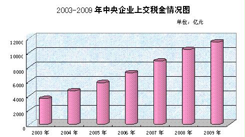 四、上交稅金情況。2009年中央企業實際上交稅金總額11474.8億元(含石油特別收益金680億元),比上年增長10.1%,比2003年增加7911.7億元,六年間年均增加1318.6億元,年均遞增21.5%。在全部上交稅金中,增值稅3782.3億元,占上交稅金總額的33%;企業所得稅2203.7億元,占19.2%;消費稅2071.9億元,占18.1%;營業稅1050.2億元,占9.2%;石油特別收益金680億元,占5.9%。2009年實際上交稅金總額超過百億元的中央企業有23家,比上年增加1家,比2003年增加15家。