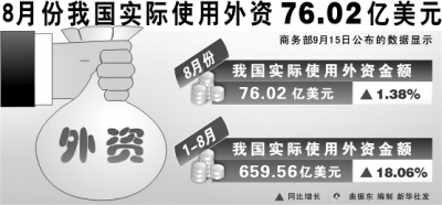 據(jù)商務部公布,2010年1至8月,全國新批設立外商投資企業(yè)16721家,同比增長18.33%,實際使用外資金額659 .56億美元,同比增長18.06%。《經(jīng)濟參考報》記者注意到,從今年3月以來,我國吸收外資金額一直保持著兩位數(shù)的高速增長,8月同比增長1.38%為近6個月來的最低增幅,僅稍高于存在春節(jié)因素的2月。