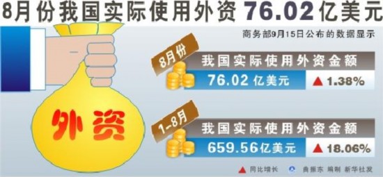 新華網北京9月15日電(記者王希)商務部15日公布的數據顯示,8月份全國實際使用外資76.02億美元,同比增長1.38%。前8個月,我國累計吸收外資659.56億美元,同比增長18.06%。