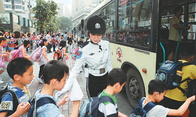 重慶女子交巡警隊員在護送小朋友上車。 新華社記者 陳誠攝