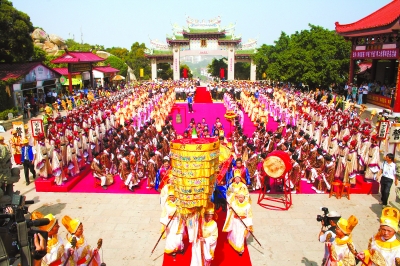 首屆海峽論壇首場(chǎng)民間交流活動(dòng)在湄洲島舉行,兩岸媽祖信眾在湄洲祖廟隆重舉行祭祀媽祖祈福大典。陳建平 攝
