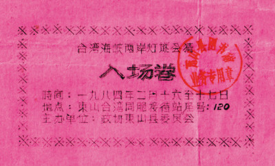 我喜歡收藏各種類型的門券,在收藏的形形色色門券中,有一張最為特別、簡(jiǎn)單和罕見。這就是27年前,也就是1984年元宵節(jié)福建省東山島舉行的臺(tái)灣海峽兩岸燈謎會(huì)猜入場(chǎng)券。看到這張粉紅色的特殊入場(chǎng)券,我的記憶又回到當(dāng)年氣氛熱烈的燈謎猜射場(chǎng)景中。
