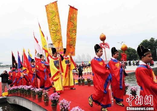 2月14日,以“弘揚臨水文化、促進兩岸交流”為主題的第四屆陳靖姑(福州)文化節在福州市南江濱公園九龍壁隆重舉行,吸引了來自兩岸各地近千名來賓及信眾同謁臨水夫人陳靖姑。圖為祭祀大典上的儀仗隊。中新社記者 劉可耕 攝