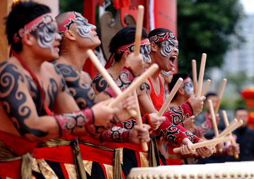 2月14日,臺灣“九天民俗技藝團”的演員在第四屆(福州)陳靖姑民俗文化節上擂響“九天戰鼓”。