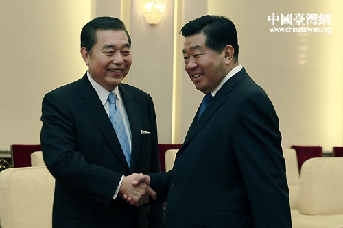 中共中央政治局常委、全國(guó)政協(xié)主席賈慶林與臺(tái)灣世貿(mào)中心董事長(zhǎng)王志剛親切握手。(中國(guó)臺(tái)灣網(wǎng) 陳佳慧 攝)