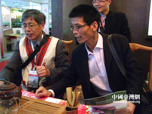 本屆農交會臺灣團團長、中華基金會副董事長蔡裕榮(左)在向采購商介紹情況。(中國臺灣網 馬迪 攝)