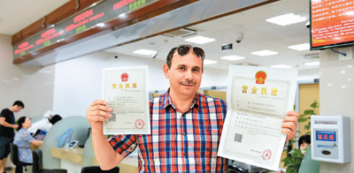 浙江義烏壓縮審批時限,外資主體登記3個工作日以內辦結。圖為來自阿爾及利亞的OTMANE在申辦營業執照。