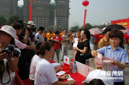 中國臺灣網8月30日合肥消息 8月26日上午,由安徽省臺辦、省國資委、省工商聯、省紅十字會聯合主辦的“兩岸一家親?皖臺傳真情”大型集中捐贈活動在合肥和平廣場舉行,安徽省內70多家愛心企業和數百市民紛紛趕到現場進行捐款。安徽省政府副秘書長張武揚、省臺辦主任朱德祥、省國資委副主任吳經華、省工商聯副主席耿學梅、省紅十字會常務副會長王強、省紅十字會專職副會長馬元淮等出席了活動。