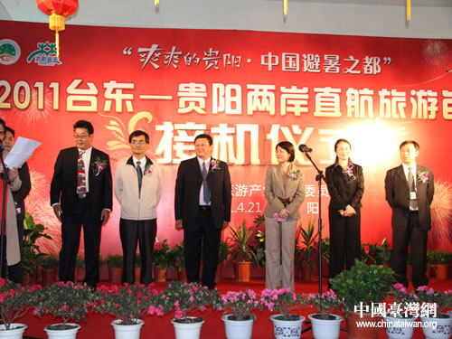 中國臺灣網4月22日貴陽消息 4月21日下午13:40分,來自臺東的旅游直航包機在貴陽龍洞堡機場降落,由臺東縣旅行商業同業公會組織,臺東旅行商及市民代表近百人組成的交流考察團抵達貴陽。