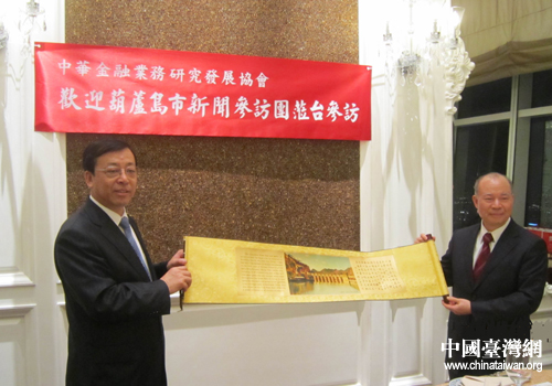 白雪峰與臺灣中華金融業務研究發展協會理事長王榮周互換禮品。(圖片來源:葫蘆島市臺辦)