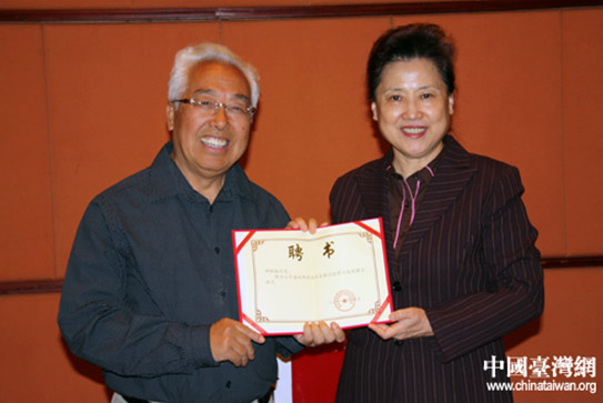 北京市臺(tái)辦主任馬玉萍向書(shū)畫(huà)名家頒發(fā)名譽(yù)顧問(wèn)榮譽(yù)證書(shū)。