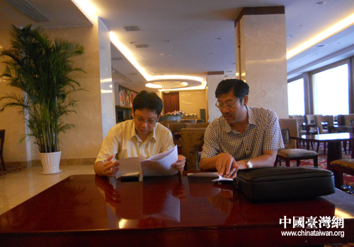 臺辦主任與臺灣省商業會副秘書長林元翔圍繞油頁巖項目洽談。(圖片來源:北票市臺辦)