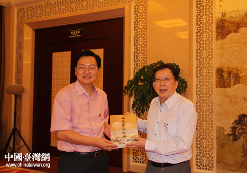 棗莊市委書記陳偉(左)向劉兆玄會長贈送禮品。(圖片來源:中國臺灣網棗莊市臺辦)