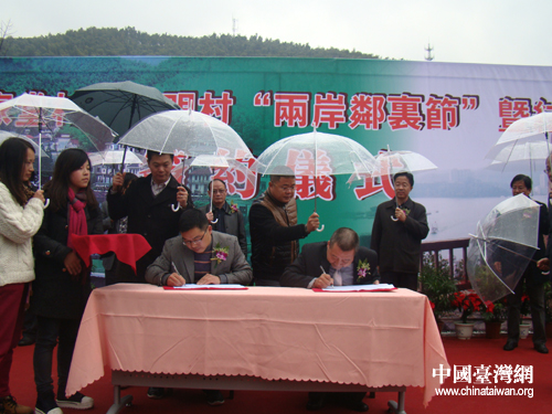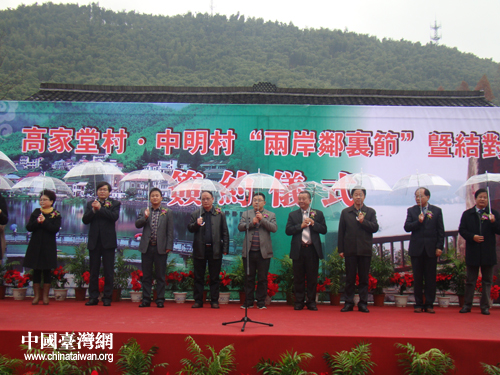 在高家堂村·中明村“兩岸鄰里節”暨結對簽約儀式上,湖州安吉縣山川鄉高家堂村村委會主任潘小眾說,因為臺灣中明村是鄉村旅游,現代農業比較不錯的地方,我們想跟他們學習一下,借鑒一下,今后多交往多交流。臺灣南投縣魚池鄉中明村村長楊昆欣表示,以后要進一步來互相互動,發展觀光和產業。儀式上,兩村簽訂了“締結友好村協議”和“婦女組織友好結對協議”。隨后舉行了座談會,兩村就相互情況進行了交流。兩村村長也親手合力種下了“友好樹”。