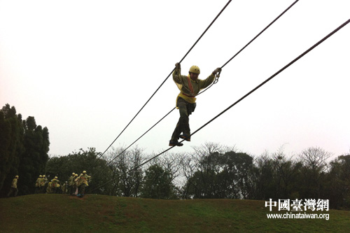 中國臺灣網2月20日桃園消息 2月19日,第五屆中華文化快車暨第二屆兩岸同心探索營在臺灣桃園埔心牧場開營。來自北京和臺灣兩地180余名學生分成AB兩組冒雨體驗了雙索行進、三索行進、垂降、攀巖、定靶射擊和信任游戲等項目的拓展訓練。
