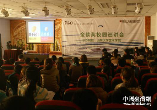 中國臺灣網3月28日濟南消息 由旺旺中時媒體集團、中國商務廣告協會、山東大學共同舉辦的第22屆金犢獎巡講會山東站于3月27日在山東大學藝術學院報告廳舉行,同時舉辦了第21屆時報金犢獎獲獎作品展覽。濟南市委臺辦巡視員謝愛民應邀參加了巡講會。