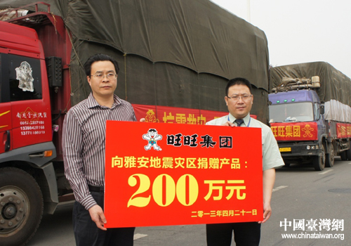 中國臺灣網4月22日雅安消息 4月21日,旺旺集團向蘆山地震災區捐贈的10車食品、飲用水等急需物資運達災區。捐贈的物資總價值達200萬元人民幣,包括3000箱牛奶、5000箱酸奶和10000多箱旺旺餅干等。在旺旺集團成都倉庫裝車啟運前,四川省臺辦副主任張軍代表接收該批賑災物資。(中國臺灣網、四川省臺辦聯合報道)