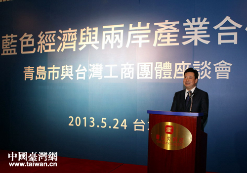 山東省委常委、青島市委書記李群在臺北向臺灣工商經濟界人士介紹青島市支持臺資企業發展擴大青臺經貿交流與合作的新舉措。(圖片來源:青島市臺辦)
