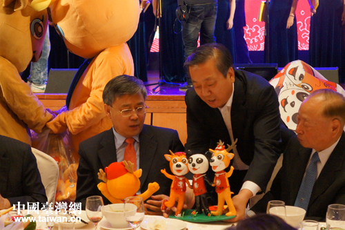 威海市臺辦主任于連波在聯誼會現場展示威海制作的動物玩偶。(圖片來源:威海市臺辦)
