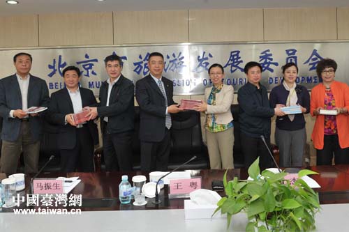 中國臺灣網4月2日北京消息 4月1日,北京市旅游發展委員會副主任王粵、北京市人民政府臺灣事務辦公室副巡視員馬振生、北京市人民政府新聞辦公室副主任白杰和來自北京市接待臺灣游客的旅行社負責人、導游40余人聚集一堂,參加《寶島游客逛北京》發書儀式。