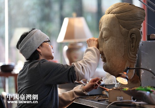 臺灣琉璃藝術(shù)家張毅介紹楊惠姍創(chuàng)作兩米高琉璃千手千眼觀音像的過程。(上海臺辦 葛鳳章 攝)