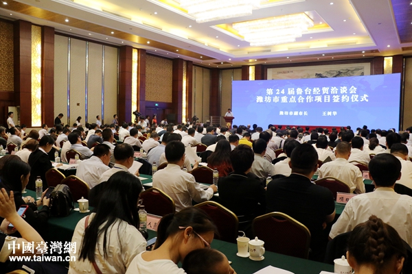 第24屆魯臺(tái)經(jīng)貿(mào)洽談會(huì)濰坊市重點(diǎn)合作項(xiàng)目簽約儀式現(xiàn)場(chǎng)。(中國(guó)臺(tái)灣網(wǎng) 趙苗青 攝)