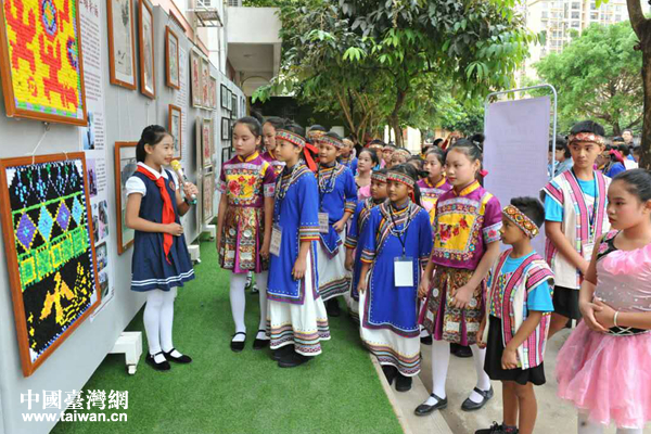 廣西民族師范學院附屬小學的紅領巾講解員給臺灣花蓮太平小學學生介紹壯族傳統藝術品——壯錦。(圖片來源:廣西臺辦)