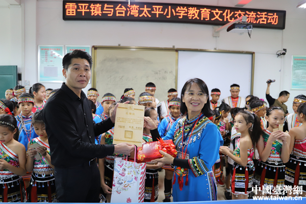 大新縣雷平鎮中心小學與臺灣花蓮太平小學交換禮品。(圖片來源:廣西臺辦)