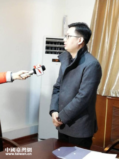 在疆常住臺胞陳文雄接受新疆電視臺采訪。(圖片來源:新疆臺辦)