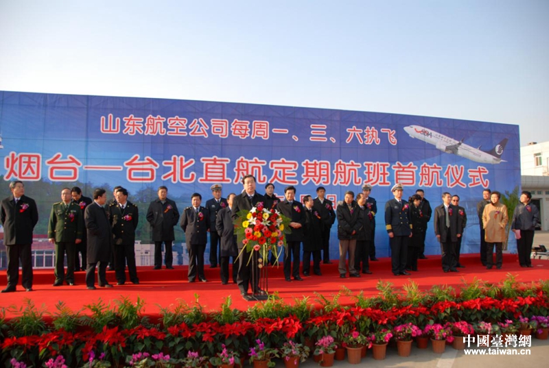 2011年2月,煙臺(tái)—臺(tái)北直航定期航班首航儀式在煙臺(tái)萊山國(guó)際機(jī)場(chǎng)隆重舉行。(圖片來(lái)源:煙臺(tái)市臺(tái)港澳辦)