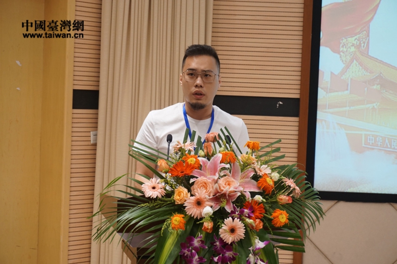 臺灣領(lǐng)隊代表、臺灣高雄中華文化經(jīng)貿(mào)交流發(fā)展協(xié)會總干事許迪代表組團方發(fā)言(圖片來源:四川省臺辦)