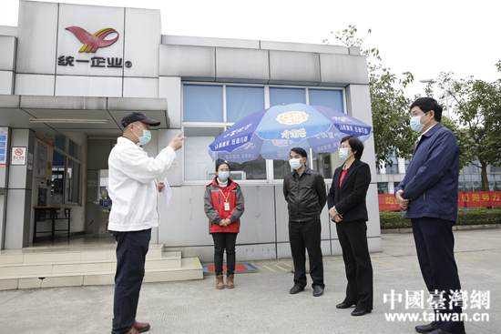 李東興、趙宏明在南寧統一企業有限公司查看企業防護措施和防控物資儲備情況。 (中國臺灣網 發)