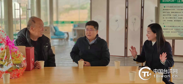 崇左市委常委、副市長蘇林(中)、崇左市臺辦主任胡小麗(右)與臺商王九齡(左)交流暢談(圖片來源:廣西崇左市臺辦供圖)