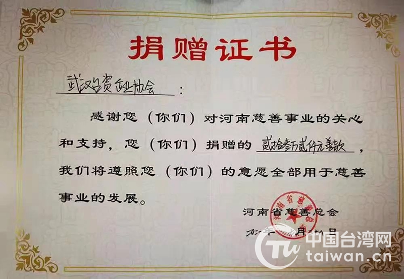 截至目前,武漢臺資企業(yè)協(xié)會將已收到的捐款合計人民幣23.2萬元,匯至河南省慈善總會“防汛抗洪馳援河南”慈善項目接收捐款專戶。河南省慈善總會發(fā)來捐贈證書,表示感謝。