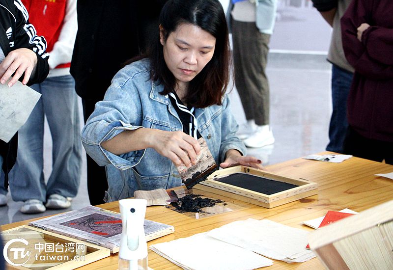 交流團成員親手體驗水墨拓印環節。(中國臺灣網發)