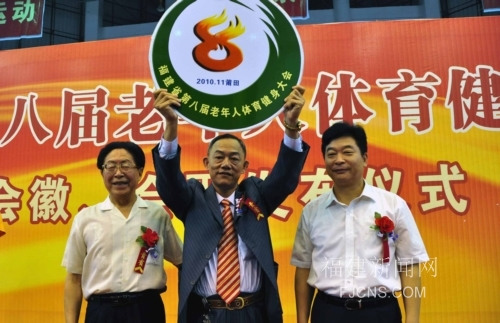 9月2日,福建省第八屆老年人健身大會會徽、會歌發布儀式在莆田市舉行。當天還舉行了福建省第八屆老年人健身大會會徽傳遞贈送儀式,參加本次大會的臺灣代表團團長黃典本參加了儀式。圖為參加本次大會的臺灣代表團團長黃典本(中)接受會徽傳遞。