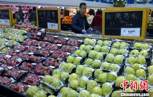 1月9日,福州市民正在超市的臺灣水果專柜前選購,年關將至,雖然臺灣水果價格比內地水果高出不少,但還是受到許多市民的青睞,福州各家超市的臺灣水果貨源也很充足。