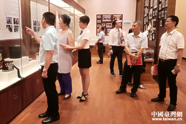 臺(tái)胞徐燕女士(左中)與兒子霍偉強(qiáng)(右三)在廣州市臺(tái)協(xié)會(huì)長(zhǎng)王治中(右二)、花都區(qū)臺(tái)協(xié)會(huì)長(zhǎng)童祖耀(右一)陪同下參觀校史館和其父徐亨事跡陳列室。(圖片來源:廣州市花都區(qū)臺(tái)辦)