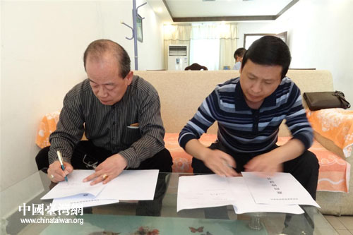 臺商莊震庭先生、副縣長黃元智簽署共同開發項目意向協議。(黔南州臺辦 吳建國 攝)