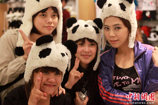 5月23日,來到臺北木柵動物園熊貓館參觀的4位年輕臺灣女孩在熊貓紀念品店選購紀念品,并一起戴上熊貓帽子合影留念。隨著“團團”“圓圓”成為木柵動物園里的動物明星,大熊貓在臺受熱捧,引來參觀客絡繹不絕。中新社發 羅欽文 攝