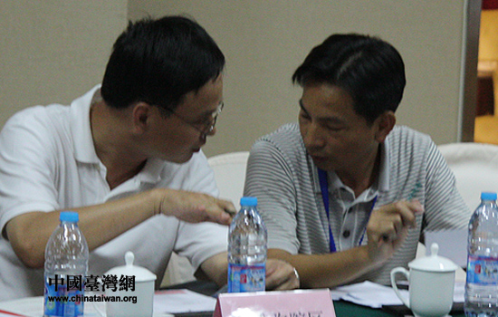 18日晚,第二屆兩岸鄉村座談舉行兩岸結對子鄉村見面會,兩岸30個鄉村代表參加。圖為結成對子的兩岸鄉村代表在交談。(中國臺灣網 張弛 攝)