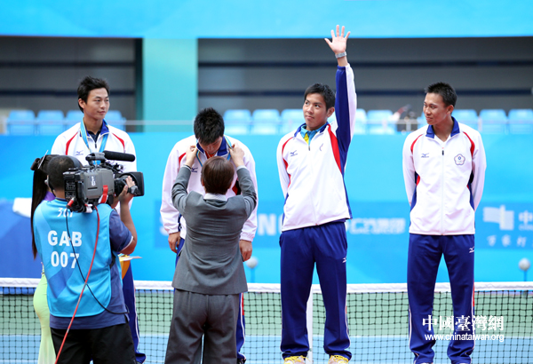中華臺北隊男網團體選手披金,站上最高領獎臺。(中國臺灣網 鐘寶華 攝)