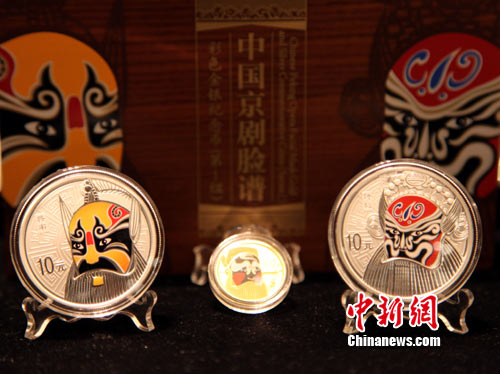中國人民銀行發行的中國京劇臉譜彩色金銀紀念幣(第1組),其中金幣1枚,銀幣2枚,新近在臺灣面市。圖為11月16日,中國金幣總公司在臺灣的總經銷,位于臺北市和平東路三段68之1號的臺灣大洋金銀幣公司展售的該套金銀紀念幣。據悉,由于臺灣有著不少的京劇票友,該套紀念幣很受歡迎。