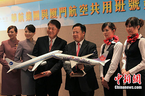 12月27日,廈門航空與華信航空在臺北簽訂航班代號共享協議,廈門航空與臺灣華信航空將自2011年1月1日起以自由銷售的形式,在廈門-臺北和廈門-高雄航線上實施代號共享合作,以有效整合雙方航班資源,雙方在這兩條航線上提供的航班數將增至每周14班和每周3班。中新社記者 關向東 攝