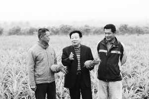 說著,大家一起走到許新宗的地里察看那些正在生長的菠蘿苗。“這是我們新引進的臺農16號,也叫‘甜蜜蜜’。”“這名字好,愿我們的生活也都甜蜜蜜!”大家的笑聲傳得很遠。