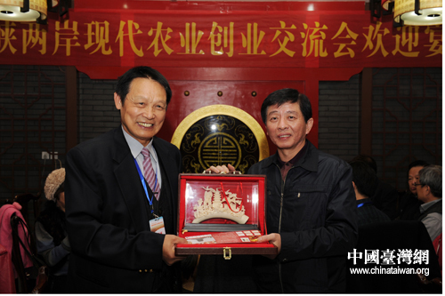 22日的歡迎晚宴上,臺灣農(nóng)田暨水利發(fā)展協(xié)會理事長黃炳煌與湖北省臺辦主任劉凱春互贈禮品。(陸勝攝)