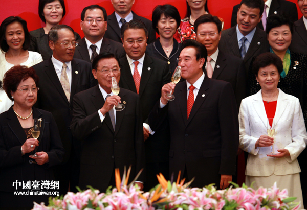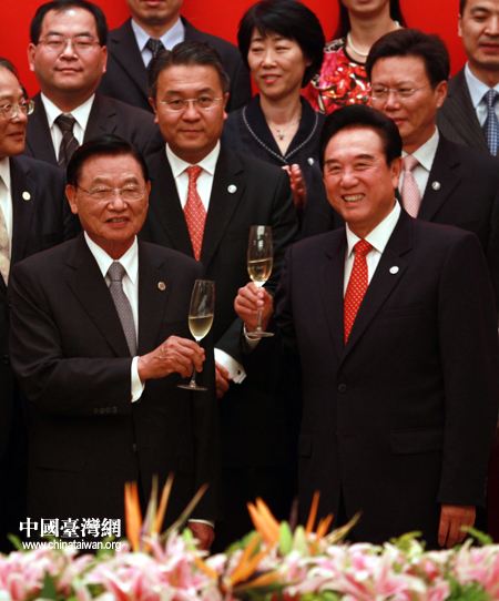 6月29日下午,海協(xié)會與臺灣海基會在重慶順利簽署兩岸經(jīng)濟(jì)合作框架協(xié)議(ECFA)以及兩岸知識產(chǎn)權(quán)保護(hù)合作協(xié)議。圖為陳云林、江丙坤舉杯互致慶賀。(中國臺灣網(wǎng) 鐘寶華 攝)