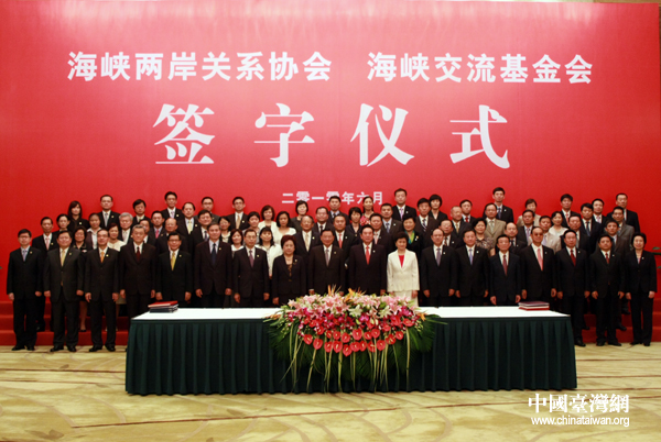 海協(xié)會會長陳云林、海基會董事長江丙坤同出席此次商談的兩會代表團(tuán)成員在簽字儀式上合影留念。(中國臺灣網(wǎng) 鐘寶華 攝)